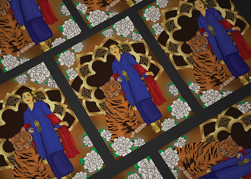 “Johoria”, celebrates Johor’s heritage by combining key symbols: a tiger (Johor’s national animal), Islamic elements, and the traditional kebaya. It features a woman in a Johor kebaya standing beside a tiger, set against an Islamic-patterned background framed with white flowers.